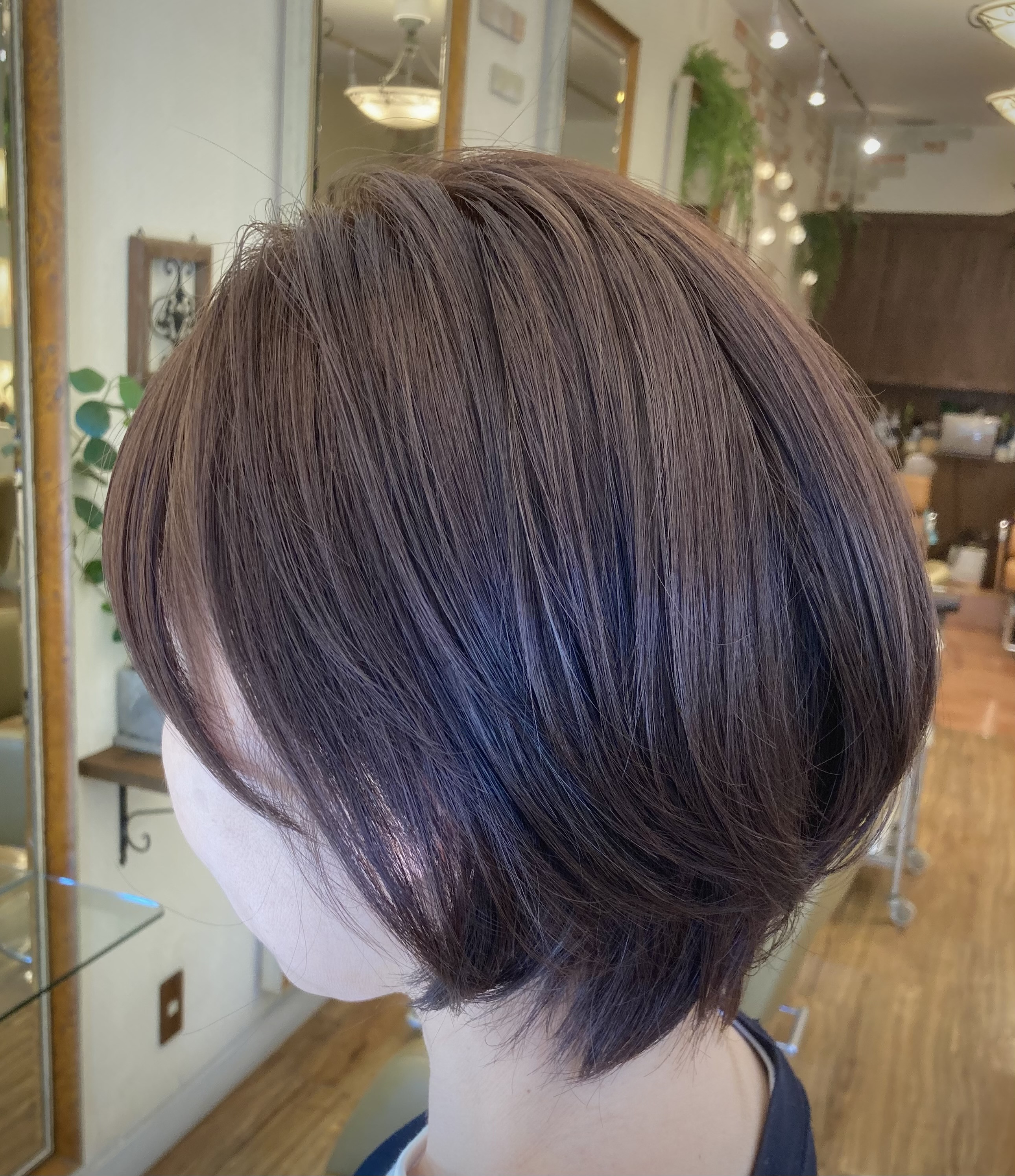 「オリーブグレージュ」のくびれがキレイな前下がりのショートスタイルです。グレイヘアーの方にもオススメのカラーです。