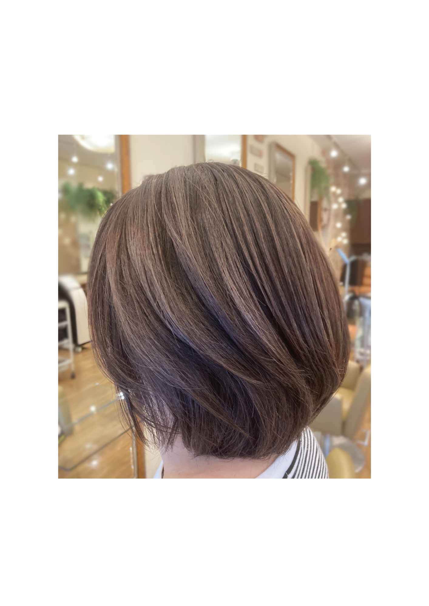 透明感のあるシフォングレーが、大人の女性の品とやさしさを引き立てるボブスタイル。 ふんわりとした毛流れが顔まわりに自然な動きを生み、軽やかな印象に。 さりげなく入れたハイライトが立体感をプラスし、明るめのカラーでも派手すぎず、上品な華やかさを演出します。 ナチュラルだけど洗練された、毎日がちょっと嬉しくなるスタイルです。